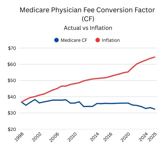 The graph below shows how the conversion factor (CF) used in the Medicare Physician Fee Schedule has generally not kept pace with inflation. This means that the dollar value paid per RVU has been flat or has even dropped at times over the years. Physicians are not immune to the increased cost of living. Additionally, as physician practice expenses, such as supplies and technology, also rise with inflation, a stagnant CF results in a functional decrease in real physician reimbursement. Even when there is a nominal increase in (CF) in a single year, physicians experience a continuous erosion of compensation for the work they perform year after year, making it harder to maintain financial viability.